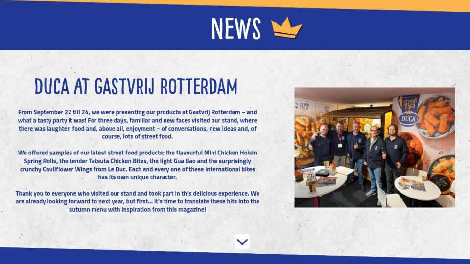 We offered samples of our latest street food products: the flavourful Mini Chicken Hoisin Spring Rolls, the tender Tatsuta Chicken Bites, the light Gua Bao and the surprisingly crunchy Cauliflower Wings from Le Duc. Each and every one of these international bites has its own unique character.