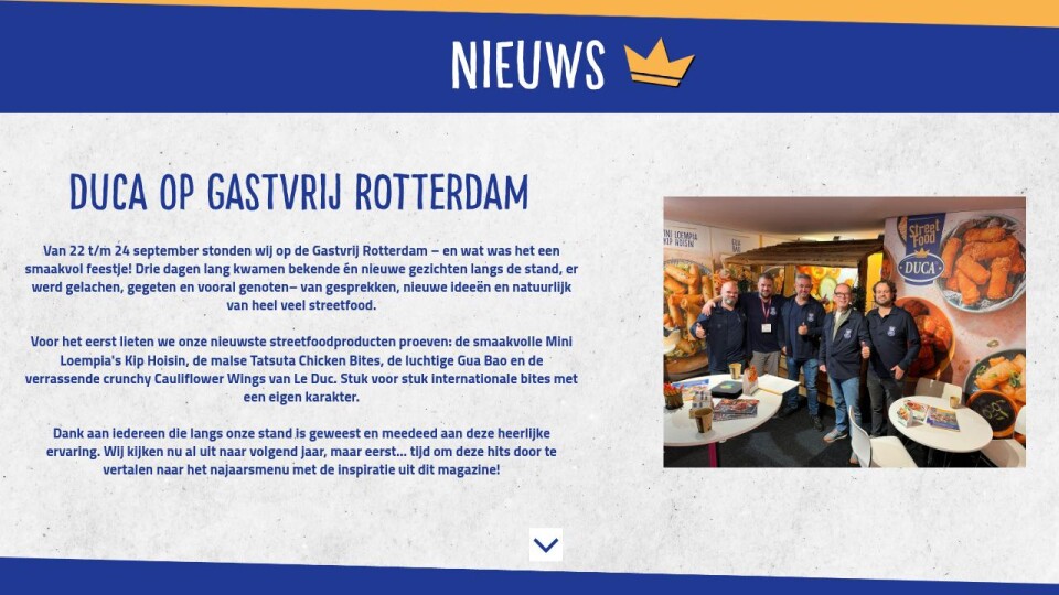 Voor het eerst lieten we onze nieuwste streetfoodproducten proeven: de smaakvolle Mini Loempia's Kip Hoisin, de malse Tatsuta Chicken Bites, de luchtige Gua Bao en de verrassende crunchy Cauliflower Wings van Le Duc. Stuk voor stuk internationale bites met een eigen karakter.