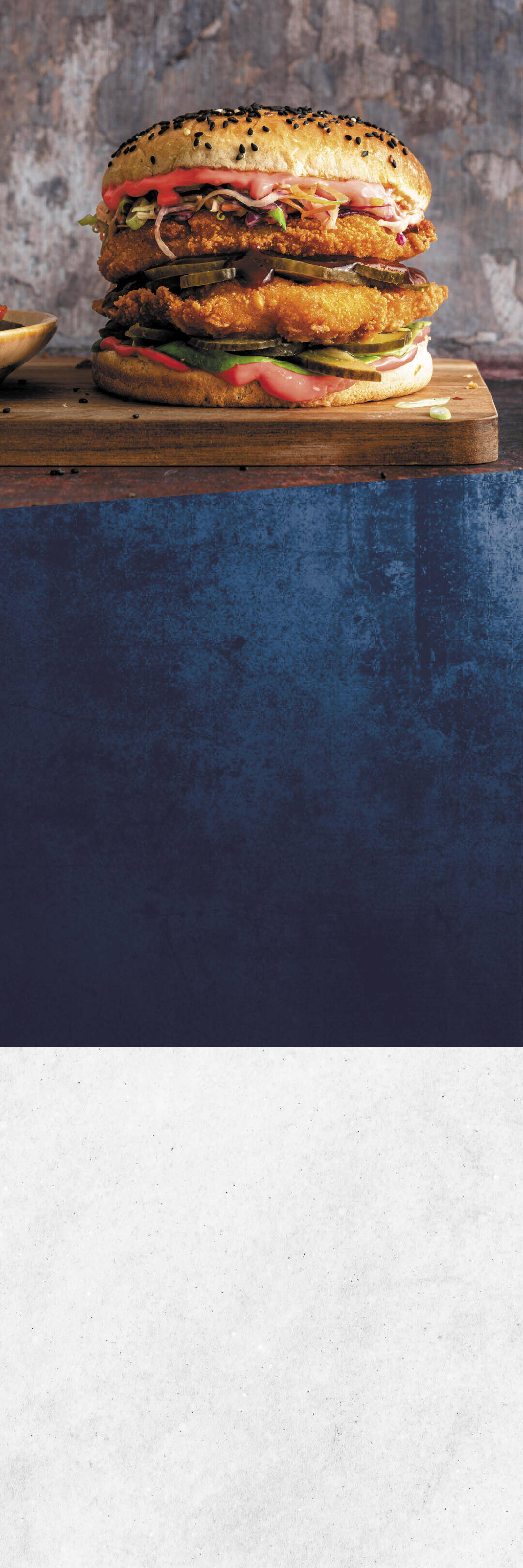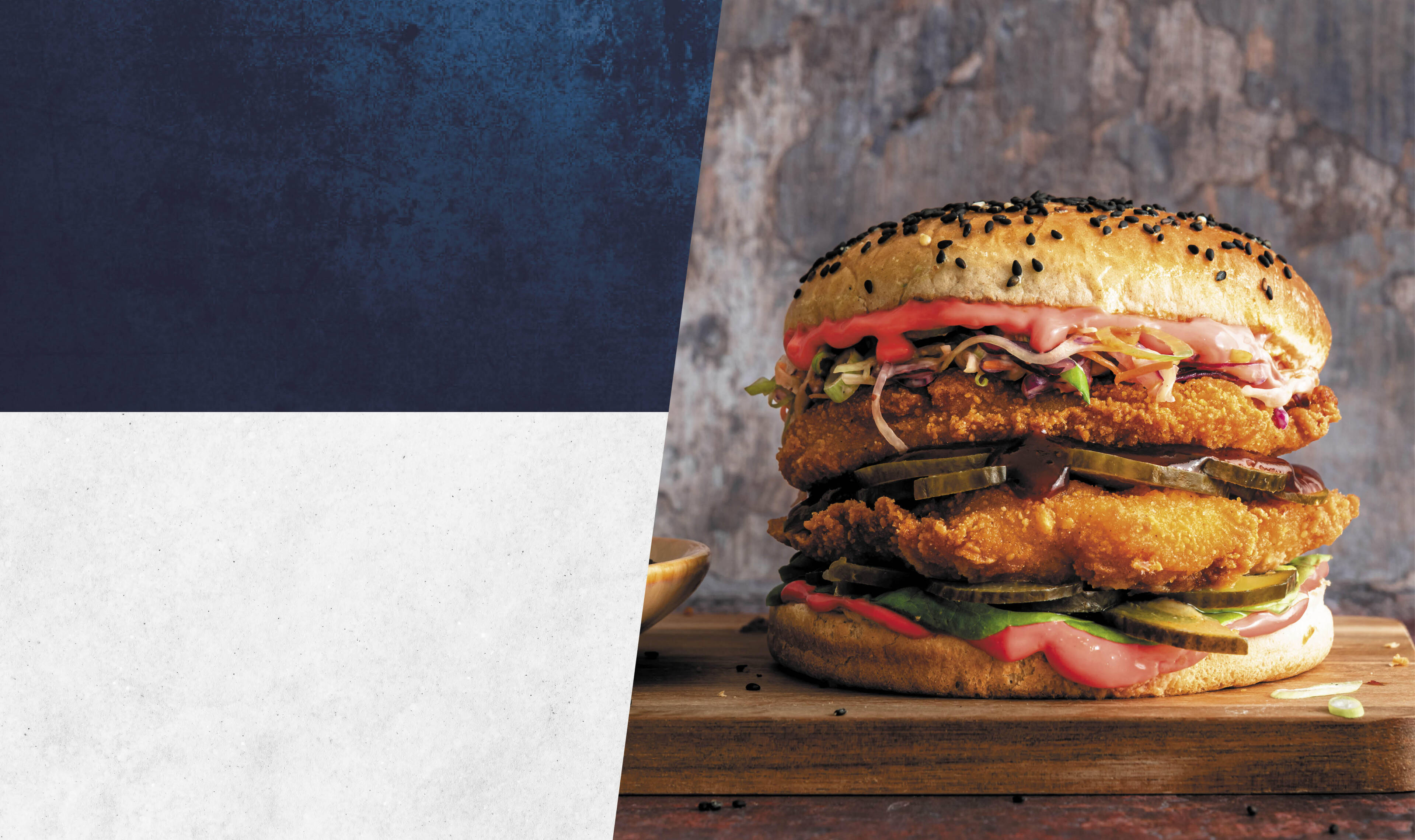 Questo doppio Crispy Chicken Burger farà risaltare la cucina coreana nel tuo menu! Il burger è condito con una salsa BBQ coreana fatta in casa a base di aglio, zenzero e gochujang, con altri ingredienti. Aggiungi l’insalata di cavolo fatta in casa con maionese, yogurt, senape e aceto di sidro di mele. Il cetriolo agrodolce aggiunge freschezza, mentre la lattuga riccia e la maionese di barbabietola rosa danno colore e cremosità extra. Servi il tutto su un brioche bun con semi di sesamo nero per una presentazione d'impatto. Un effetto accattivante che combina perfettamente comfort food e street food globale.