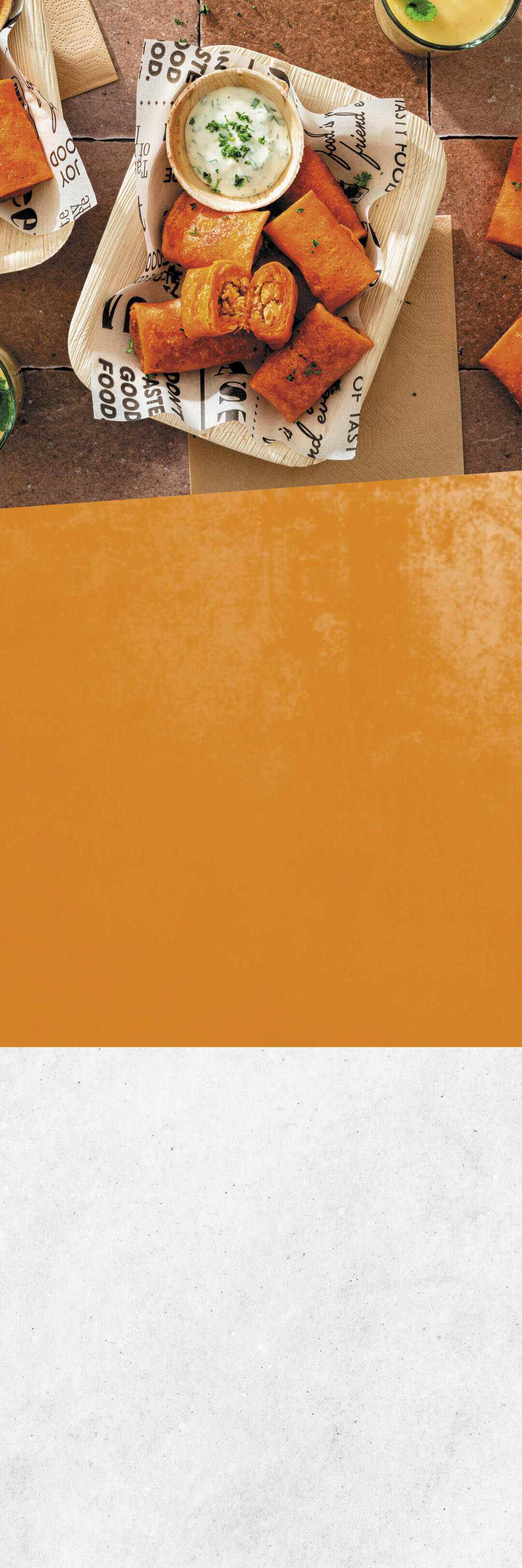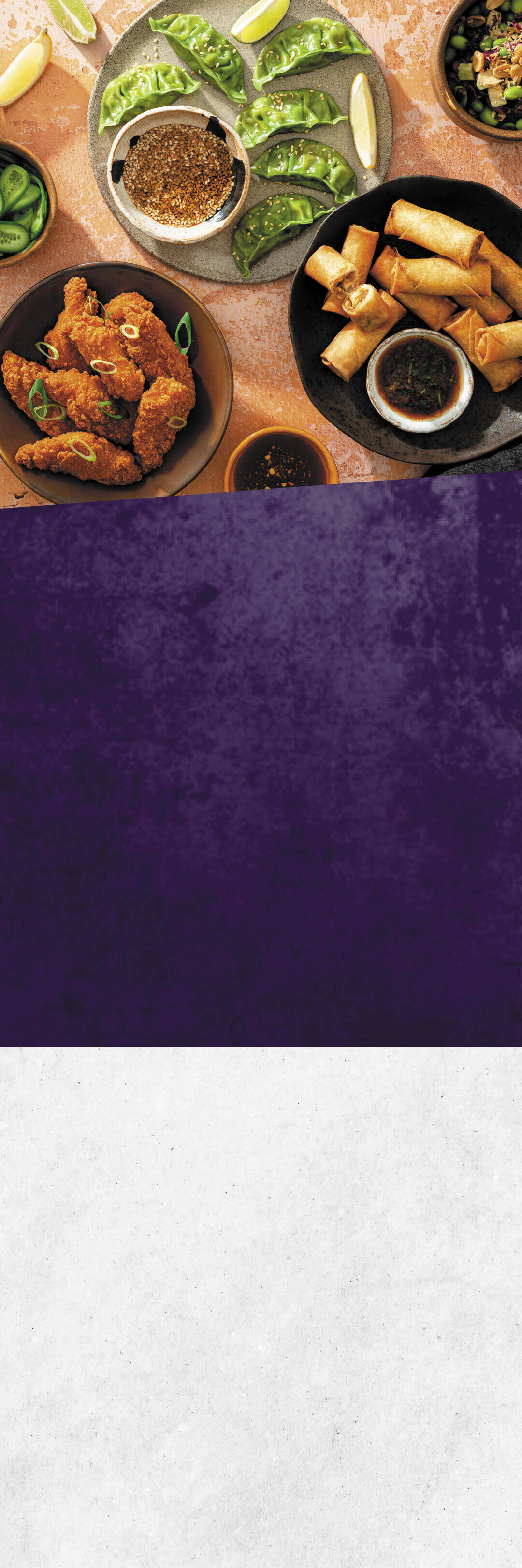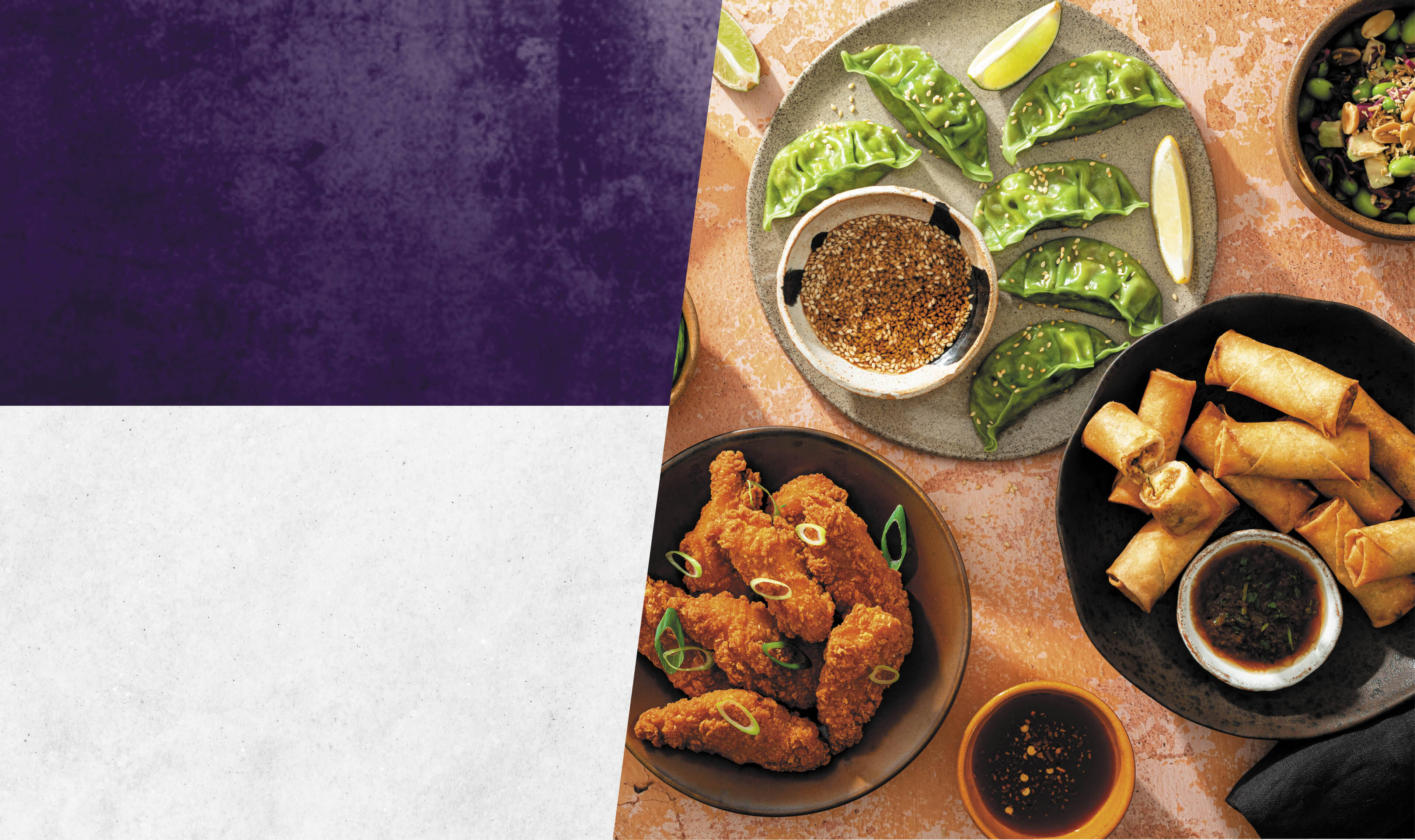 Prepara una tavolata piena di colori e idee con assaggi dal tocco asiatico! I nostri Mini Chicken Hoisin Spring Rolls sono accompagnati da una salsa allo zenzero, soia e coriandolo. I Vegan Gyoza ottengono un fresco ponzu dip con un topping di semi di sesamo, e i Crispy Chicken Tenders sono abbinati a una salsa piccante honey-sriracha e cipollotti tritati finemente. Servi il tutto con una gustosa insalata asiatica che include edamame, cavolo rosso e avocado.